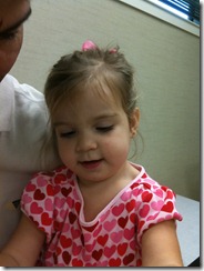 I already had a call into the doctor because both girls had runny noses. When the doctor called back, I mentioned the slide incident and my doc said that if she didn’t put any weight on it at all by the morning, call in and make an appointment. She also said that if it woke her up at night, to bring her in. Since she never put any weight on it and was up from about 1:30 until 4 am, we got in to see the doctor. He sent us to get an x-ray and the doctor saw it right away. It’s broken. I really didn’t think it was. I really thought all this was precautionary and we would just let it heal or something. They started talking about a cast and I was freaking out inside. I was lucky that my next door neighbor is the administrator at the Imaging Center and she was with us the whole time. My sister had also come over in the morning to help me. She was miraculously off this Thursday. She is never off on Thursdays and I am so lucky that she had this one off for some reason. She helped me with both the girls at the first and second doctors office and watched Aliza while I took Marielle to get the cast.